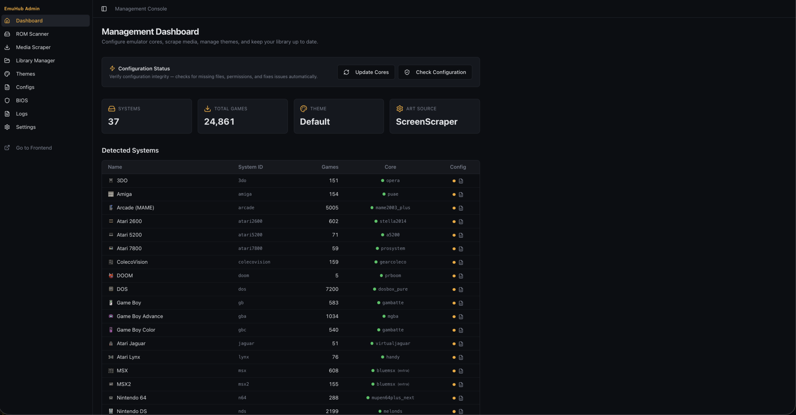 EmuHub includes a streamlined configuration system that automatically generates all necessary files and game lists for the frontend. A built-in ROM scanner ensures your library is properly structured and verifies that everything is in place before building out the configuration.
