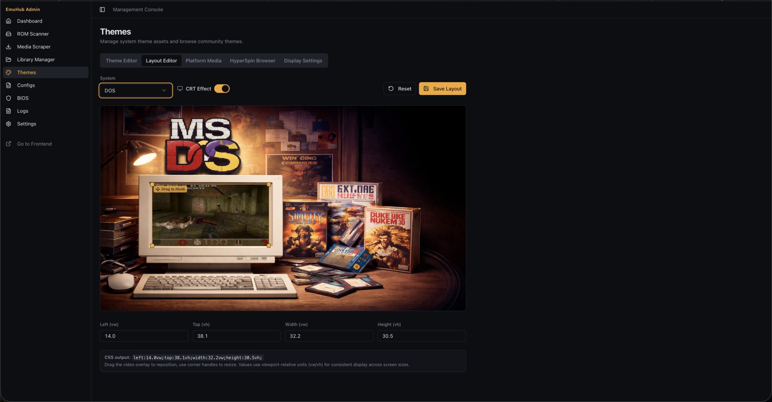 A full theme manager lets you modify system themes or create your own. You can use default assets, scraped media, or custom uploads—and even fine-tune layouts with a built-in editor to position videos and artwork exactly how you want.